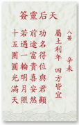 妈祖天后灵签第七签:乙丑 (属土利年 四方皆宜) 天后妈祖灵签第七签:诗曰 云开月出正分明,不须进退问前程;婚姻皆由天注定,和合清吉万事成。 妈祖天后灵签第七签:签诗语译 台
