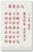 妈祖天后灵签第二十七签:戊丑 (属木利春 宜其东方) 天后妈祖灵签第二十七签:诗曰 君尔宽心且自由,门庭清吉家无忧;财宝自然终吉利,凡事无伤不用求。 妈祖天后灵签第二十七签